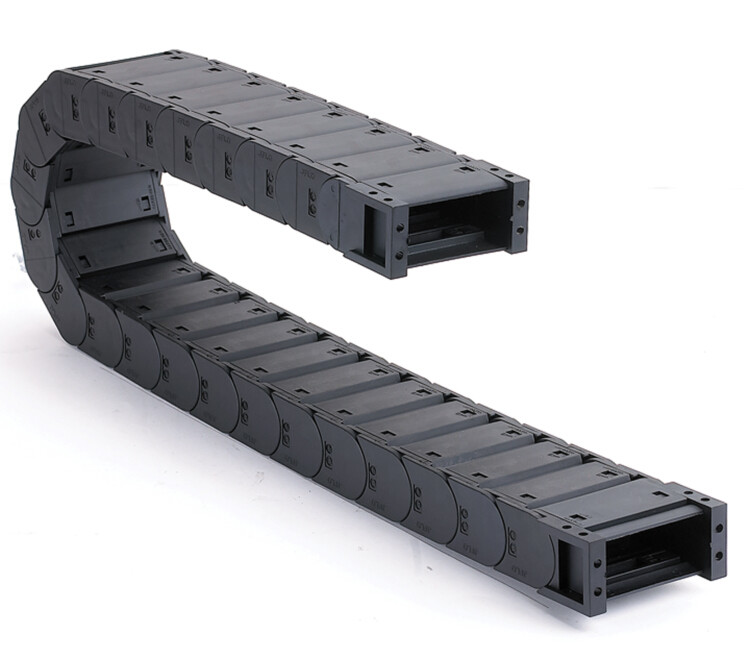 工程拖鏈用途和特點:1、拖鏈每節都能打開,便于安裝和維修,運動的噪音低、耐磨、可高速運動。 2、拖鏈已被廣泛應用于數控機床、電子設備、石材機械、玻璃機械、門窗機械、注塑機、機械手、起重運輸設備、自動化倉庫等。 3、拖鏈外形似坦克鏈,由眾多單元鏈節組成,鏈節之間轉動自如。 4、相同系列的拖鏈內高、外高、節距相同,拖鏈內高、彎曲半徑R可有不同的選擇。 5、單元鏈節由左右鏈板和上下蓋板組成,拖鏈每節都能打開,裝拆方便、不必穿線,打開蓋板后即可把電纜、油管、氣管等放入拖鏈內。