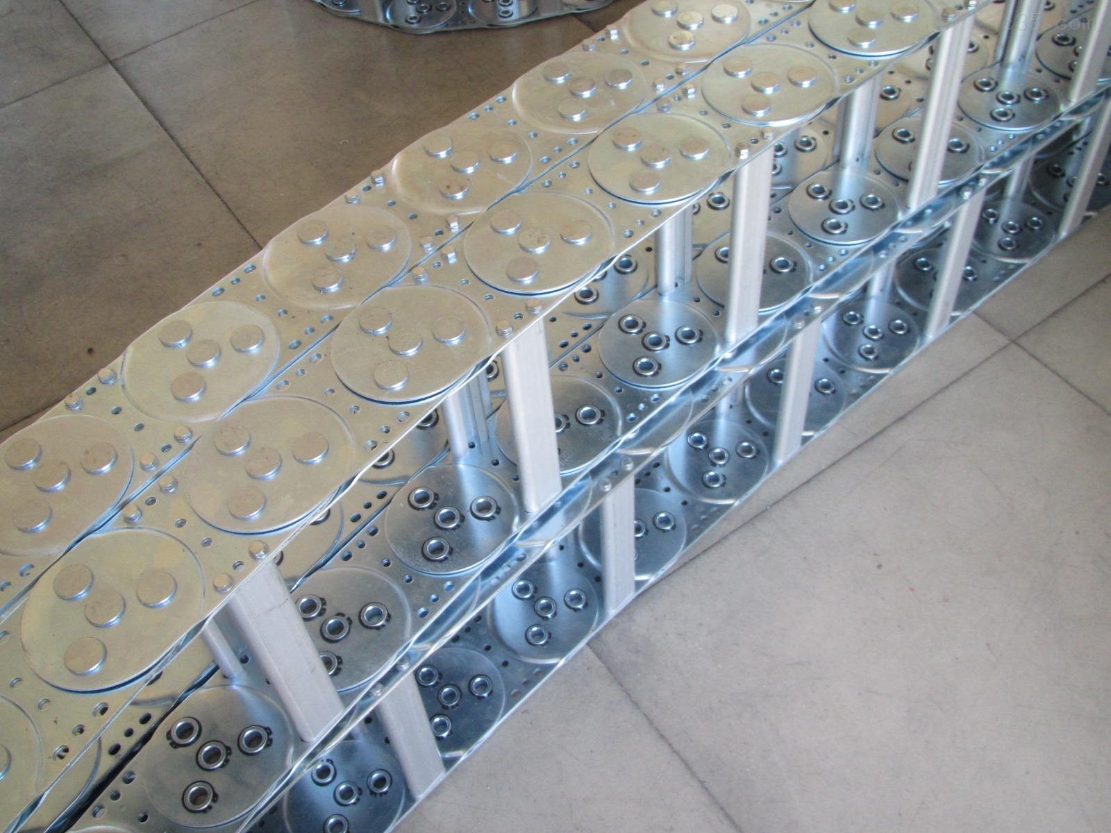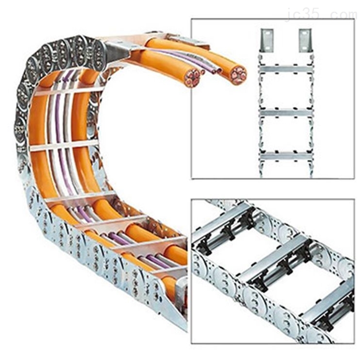 鋼制拖鏈的主體是由鏈扳(優質鋼板鍍鉻)、支撐扳(擠拉鋁合金)、軸銷(合金鋼)等部件組成,能使電纜或橡膠管與拖鏈之間不產生相對運動,不產生扭曲變形。鏈扳經鍍鉻處理,外形效果新穎結構合理,靈巧度高,鋼性好而不變形,安裝方便,使用可靠,易于拆裝,尤其是采用高強度耐磨材料合金銅為軸銷,提高了產品的耐磨強度,彎曲更靈活,阻力更小,降低了噪音,從而可保證長時間使用不變形,不下垂。