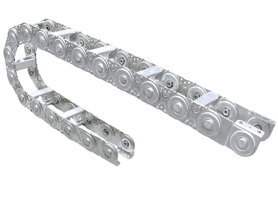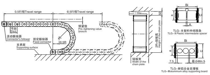 TLG型鋼鋁拖鏈可承載數(shù)量多,重量大的電纜及油管,自由懸置(允許不用支承輪)長度大,支撐板可依顧客需要制作,適用于工作母機,移動機械等。其彎曲半徑為50-600mm,鏈板高度為35-150mm,可任意選用。