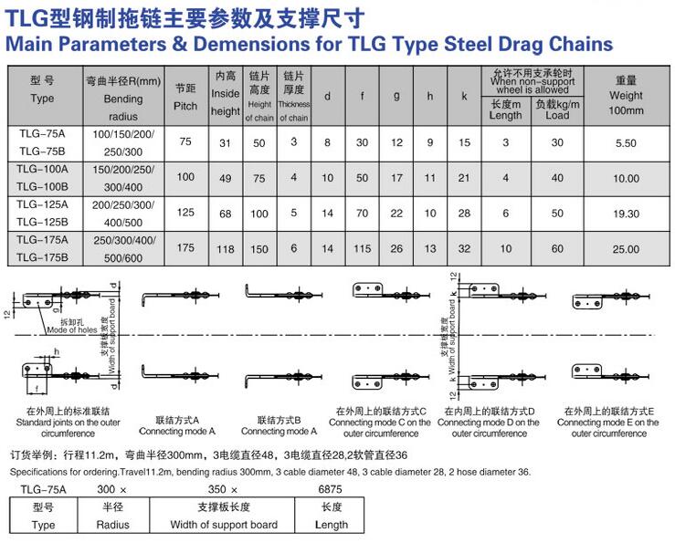 我們每二節(jié)鏈板提供一條支撐板。如每一節(jié)均需支撐板,請在訂貨時,訂10A/20A/30A/40A/50A,而不是10B/20B/30B/40B/50B。即TLG20A/200×2100/200“h”或TLG20B/200×2100/200“h”。